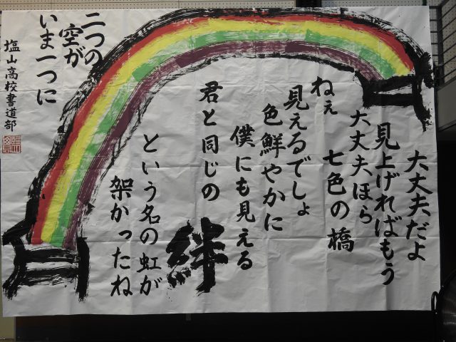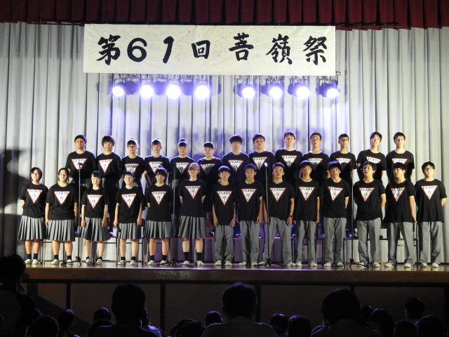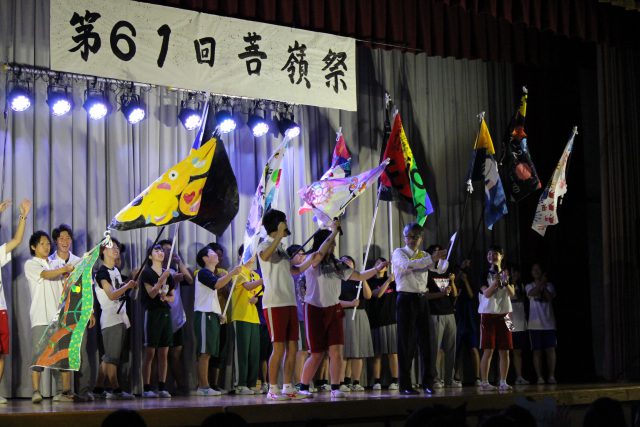 山梨県立塩山高等学校 > 学校行事 > 第61回 菩嶺祭がおこなわれました。 2018年7月6日カテゴリー: 学校行事 生徒会活動 第61回 菩嶺祭がおこなわれました。 2018.7/4(水)・5(木) 「Memory ~皆で作り上げる青春の1ページ」のテーマの基、2日間にわたって行われました。定期試験後の準備期間も少ない中ではありましたが、各クラス一丸となりみんなで協力しながら取り組み、まとまることができました。2日目の名店街はあいにくのお天気で、準備からオープン時間中ずっと雨に降られてしまいましたが、それでも生徒たちは一生懸命取り組んでいました。足場のわるい中を、たくさんの保護者の皆様にご来場いただき盛況に終わることができました。心から感謝申し上げます。 クラス旗と開催宣言 1年生 合唱 3年生 クラス発表 2年生 クラス発表 名店街 名店街 華道部 茶道部 保健委員会 書道部 PTAバザー 図書委員会 古本市
