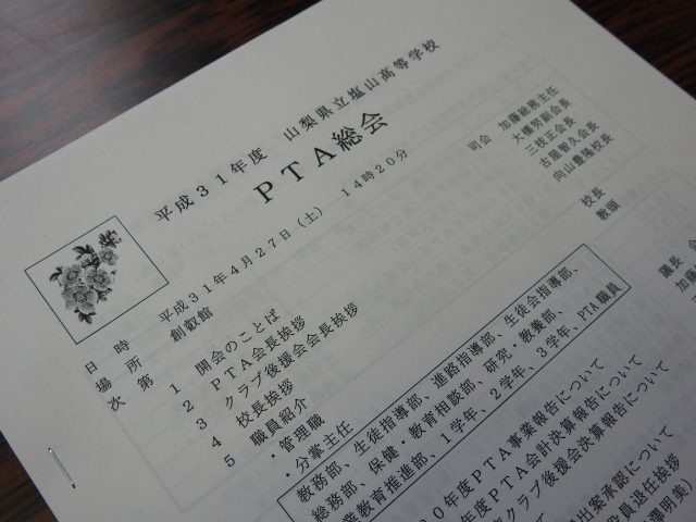 山梨県立塩山高等学校 > お知らせ > 公開授業・クラス懇談会・学年部会・PTA総会がおこなわれました。 2019年4月27日カテゴリー: お知らせ 学校行事 公開授業・クラス懇談会・学年部会・PTA総会がおこなわれました。 2019.4.27(土) 朝から各教室では水曜日の授業を実施しました。3校時を公開授業として、普段の授業の様子を保護者の皆さまに見学していただきました。午後からはクラス懇談会、学年部会、3学年進路講演会、PTA総会がおこなわれました。 お忙しい中をご参加くださいました保護者の皆さま、ありがとうございました。