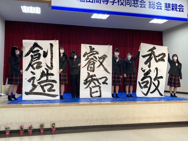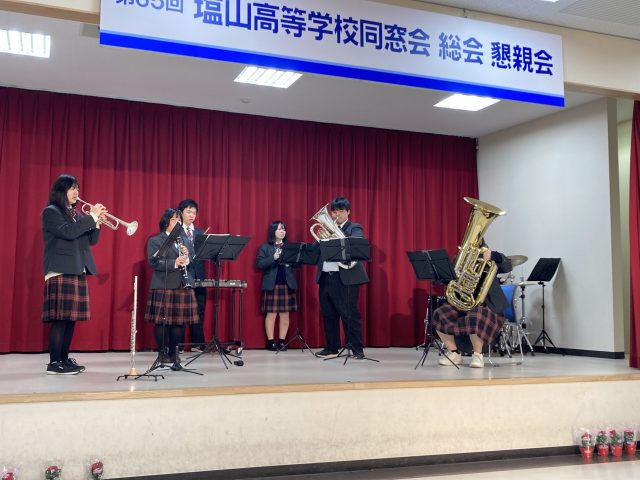 山梨県立塩山高等学校 > お知らせ > 同窓会の活動 > 令和5年度 同窓会総会 2023年12月1日カテゴリー: お知らせ 同窓会の活動 令和5年度 同窓会総会 11月25日に第65回同窓会総会が甲州市中央公民館で行われました。総会に続いて行われた懇親会では、現吹奏楽部、書道部の生徒が同窓生の皆様の前でパフォーマンスを披露いたしました。先輩方を前に生徒たちは緊張した様子でしたが、同窓生の皆様が心から楽しんでくださっている姿に、また来年もやりたい!と終了後には興奮気味に話していました。 同窓生の皆様におかれましては、今後もあたたかい目で本校生徒を見守り、ご指導いただけますよう、よろしくお願いいたします。