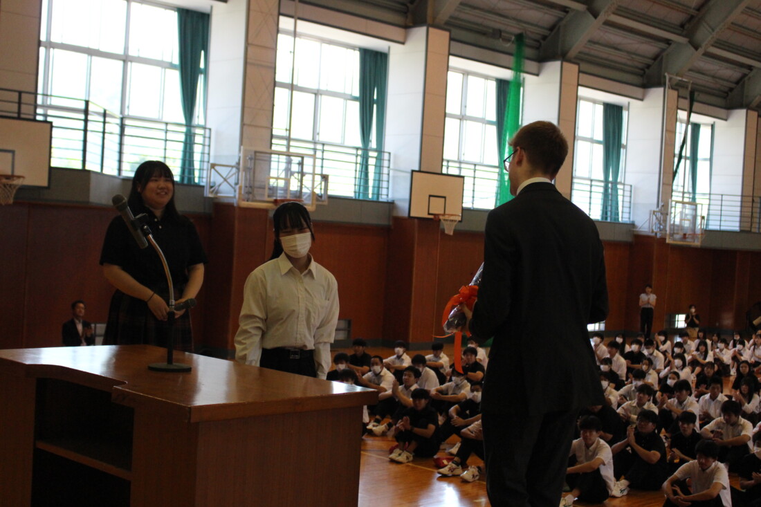 また、同日にALTの退任式を行いました。帰国されるALTの先生から塩山高校に対する思いのこもった最後のお話を、生徒たちはジッと聞き入っていました。