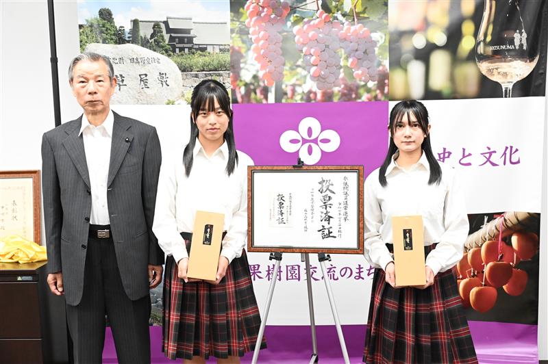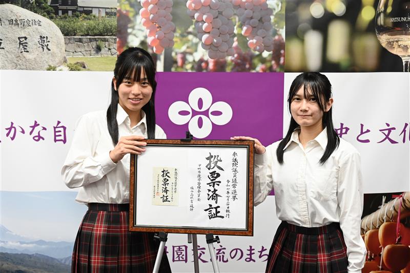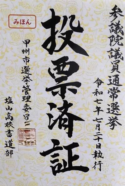 山梨県立塩山高等学校 > お知らせ > 甲州市「投票済証」を書きました!~書道部~ 2025年7月14日カテゴリー: お知らせ 甲州市「投票済証」を書きました!~書道部~ 7月20日の参議院選挙にあたり、甲州市から依頼を受け「投票済証」を書道部が揮毫しました。中央の「投票済証」の文字を3年生の野田千尋、両脇の文字を3年生の雨宮来咲が書きました。 7月3日に甲州市役所で行われた制作報告会では、甲州市選挙管理委員長岩下洋氏より、あたたかいねぎらいのお言葉とともに、これを機に若い人たちの投票が増えることを期待したいとお話をいただきました。 この時の様子、7月10日の山梨日日新聞の1面と15面でも紹介されました。投票率の向上に貢献できれば光栄です。 岩下甲州市選管理委員長から墨を記念にいただきました。