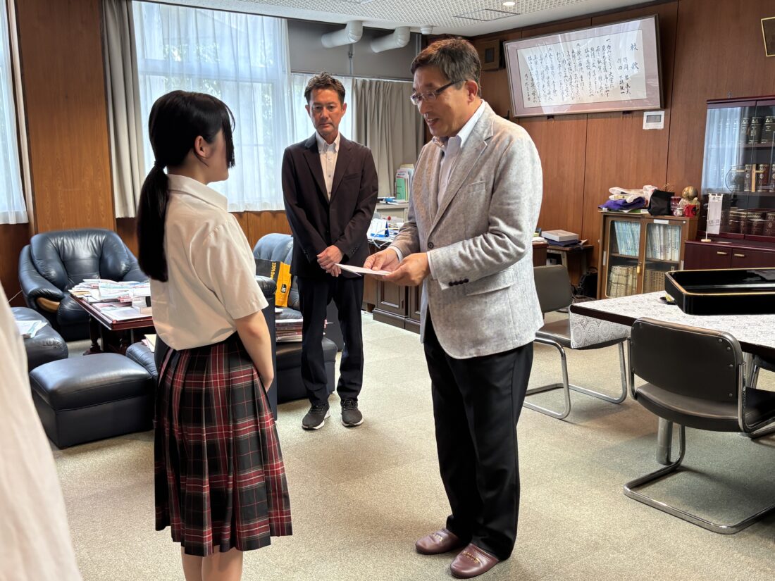22日に同窓会奨学金の贈呈式を行いました。この奨学金は、本校同窓会が平成28年の創立60周年を機に、向学心に富み、真摯な態度で学校生活を送っている生徒に対し、修学及び進路選択に役立ててもらおうと、返還義務のない奨学金を支給するという趣旨のもと設立されました。毎年普通科・商業科の2・3年生より各1名、計4名に贈られています。日頃より同窓会の皆様には本校生徒のためにご尽力いただき、心より変感謝申し上げます。