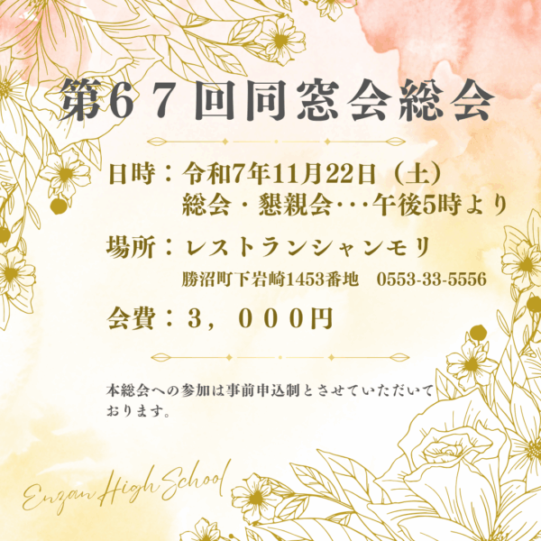 令和7年度、塩山高校同窓会総会の開催について以下をご覧ください。また、同窓会の活動についてはこちらからも発信しております。