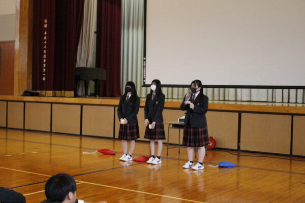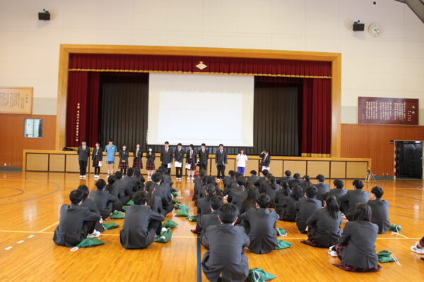 9日に、生徒会役員紹介および部活動紹介を行いました。生徒会役員紹介では、今年度の生徒会役員が新1年生の前に立ち、それぞれ自己紹介を行いました。