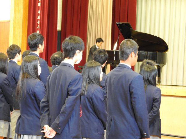 山梨県立塩山高等学校 > お知らせ > 新任式・始業式がおこなわれました。 2018年4月10日カテゴリー: お知らせ 学校行事 新任式・始業式がおこなわれました。 平成30年4月9日(月) 新年度がスタートしました。午前9:00から体育館で新任式・始業式がおこなわれました。集まった2、3年生を前に、向山校長先生より10名の新任の先生方をご紹介いただき、教頭先生が代表してご挨拶されました。引き続きおこなわれた始業式では、校長先生より生徒に向けて、たとえ小さくても目標を立てることの大切さ。そこに向かって一年間努力して取り組んでいくことの大切さ。また人生はその積み重ねであるという貴重なお話をいただきました 新任式 始業式 壇上で話す 村田優希(3年)